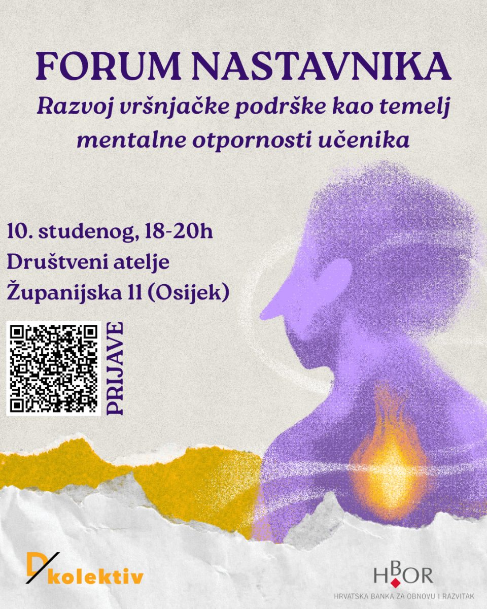 Na četvrtom Forumu nastavnika bavit ćemo se temom razvoja vršnjačke podrške kao jednog od ključnih elemenata mentalne otpornosti učenika. Kroz otvoreni i interaktivni razgovor istražit ćemo kako učitelji i nastavnici mogu podržati razvoj kulture podrške među učenicima te na koji način mogu jačati vlastite kapacitete i otpornost, osobito u kontekstu sve kompleksnijih i različitijih poteškoća s kojima se učenici, a onda i nastavnici, danas suočavaju.