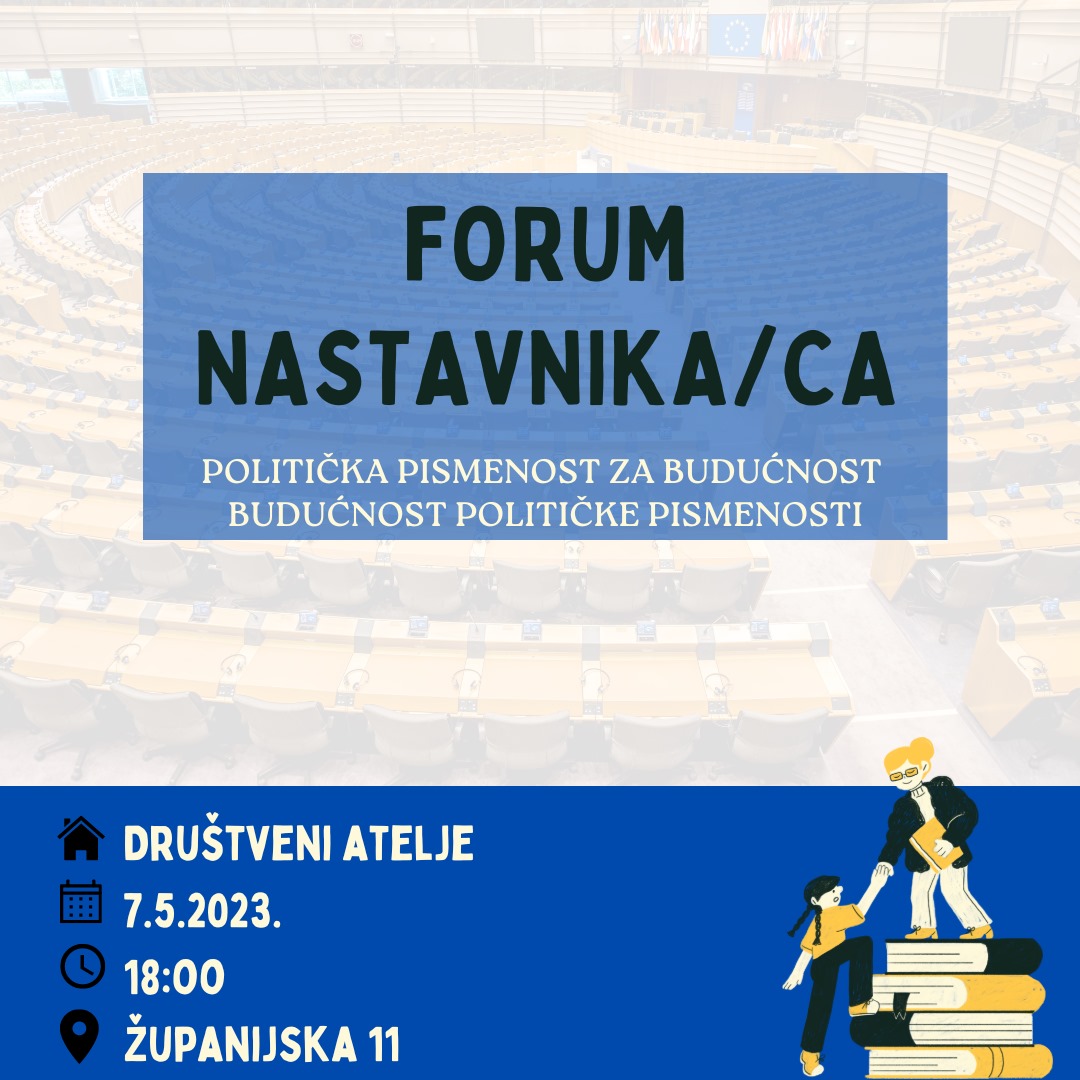 Pozivamo vas da sudjelujete u našoj aktivnosti Forum nastavnika, koja će se održati 7.5.2024. u 18h, u prostoru Društvenog ateljea, Županijska 11 (dvorišni prostor).