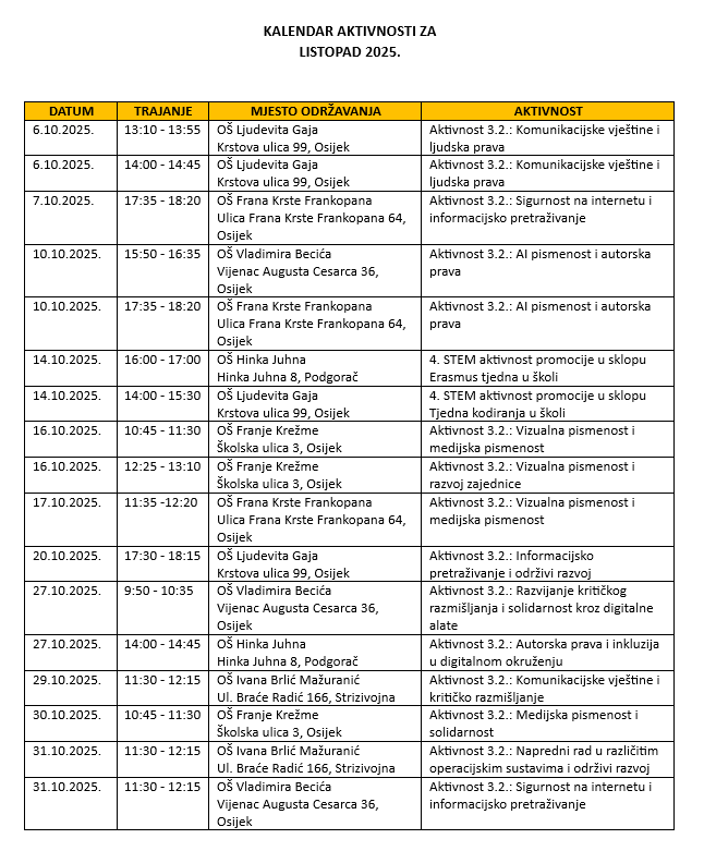 U kalendaru je uklonjena radionica u OŠ Hinka Juhna u Podgoraču 27. listopada u 13:05-13:55. Izmjenjeni raspored radionica nalazi se u kalendaru aktivnosti.