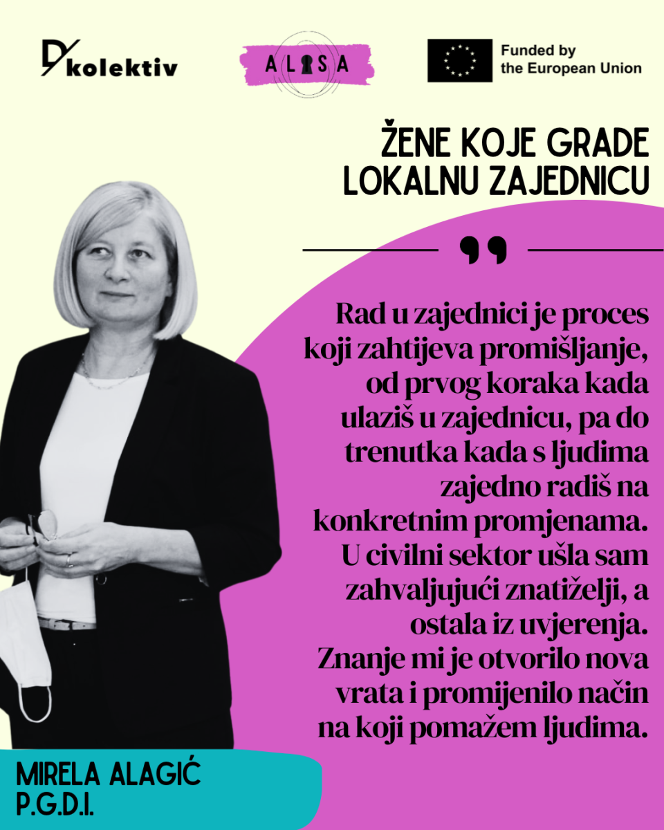 Topla i otvorena prema ljudima, ustrajna i skromna, Mirela Alagić već više od 25 godina ima važnu ulogu u razvoju lokalne zajednice i civilnog društva. Na pitanje tko je ona, Mirela jednostavna, kakva je, kaže: Ja sam prije svega majka svojoj djeci, partnerica svom suprugu, kolegica i socijalna radnica. Sve te uloge jednako me određuju.“