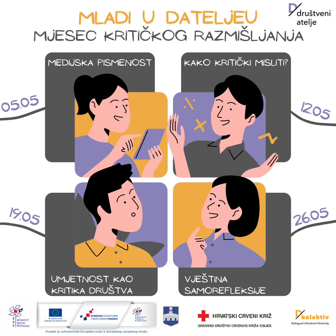 Za vas smo pripremili edukaciju "Mjesec kritičkog razmišljanja" koja se sastoji od četiri radionice namijenjene razvoju kritičkog razmišljanja, kao osnove za razvoj društva koje promišlja, uočava i odgovorno djeluje.