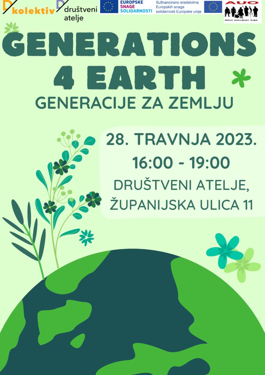 DKolektiv u suradnji s Aktivnim umirovljenicima Osijek povodom Dana planeta Zemlje i Europskog dana međugeneracijske solidarnosti organizira festival "Generations4earth", 28. travnja od 16 do 19 sati u dvorištu u Županijskoj 11.