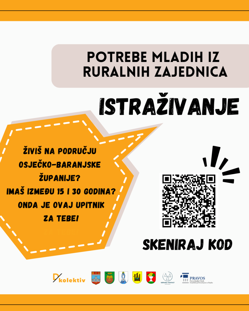 Istraživanje se provodi u okviru projekta „Mobilni atelje: društvene inovacije mladih za revitalizaciju ruralnih zajednica“ i usmjereno je na procjenu potreba mladih koji žive u ruralnim sredinama Osječko-baranjske županije. Cilj istraživanja je bolje razumjeti svakodnevne izazove, dostupnost usluga, uvjete života i područja u kojima je mladima potrebna dodatna podrška, kako bi se razvili kvalitetniji programi za mlade u ruralnim zajednicama.