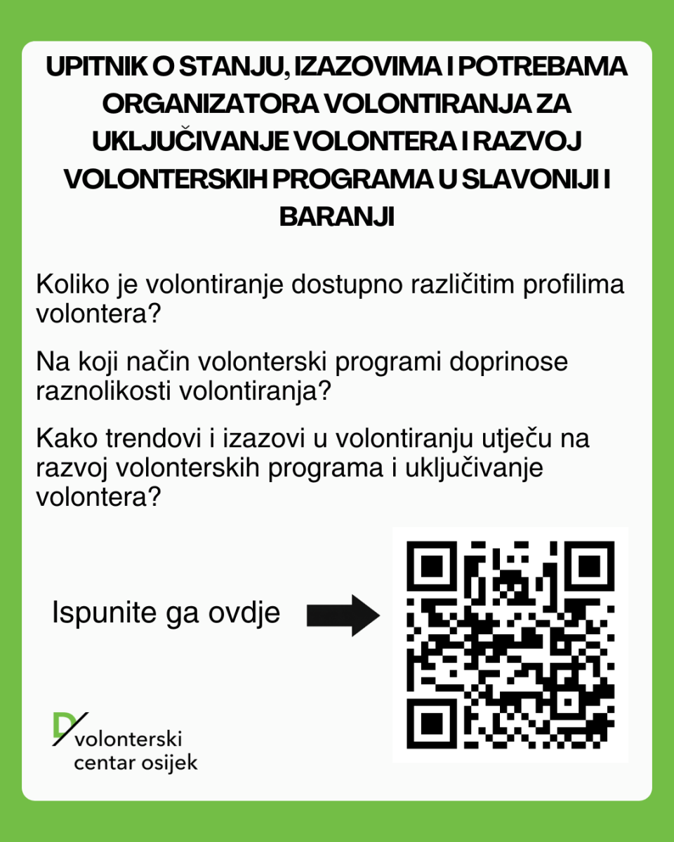Pred Vama se nalazi upitnik o stanju, izazovima i potrebama organizatora volontiranja za uključivanje volontera i razvoj volonterskih programa u Slavoniji i Baranji. Ispitivanje provodi DKolektiv - organizacija za razvoj volonterstva kroz program Volonterskog centra Osijek čije je djelovanje sufinancirano sredstvima Ministarstva rada, mirovinskoga sustava, obitelji i socijalne politike.